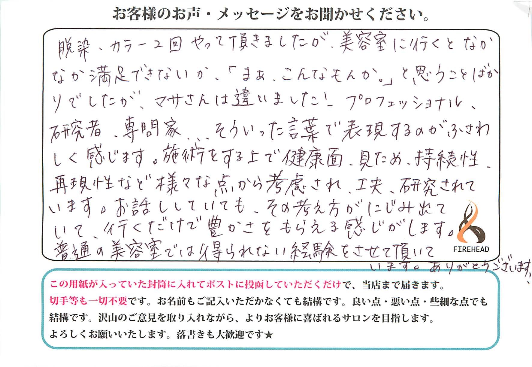 そう信じで、日々精進してテクニックを磨き、結果この様なお言葉を頂けることは私達にとって何にも代えがたいとても嬉しい事です。